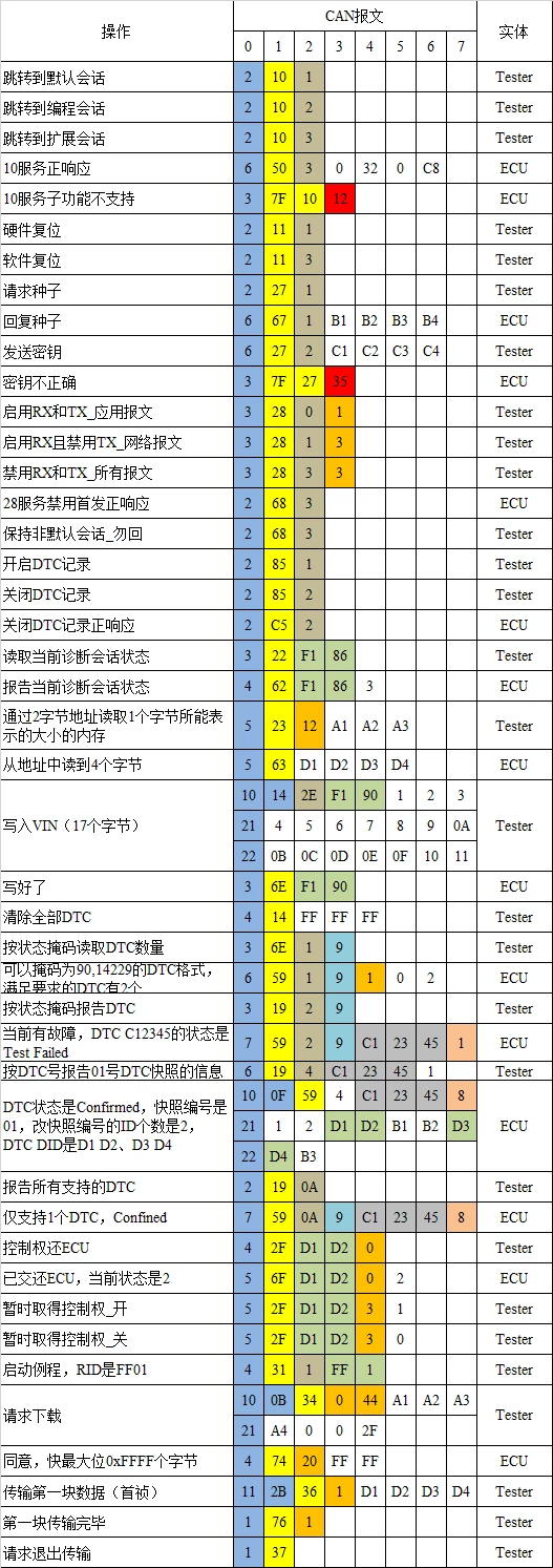 UDS的请求命令有4种构成方式,即SID,SID+SF(Sub-function),SID+DID(Data Identifier)(读写用),SID+SF+DID。每种服务都有自己不同的构成方式,查看服务说明即可,不用死记硬背。