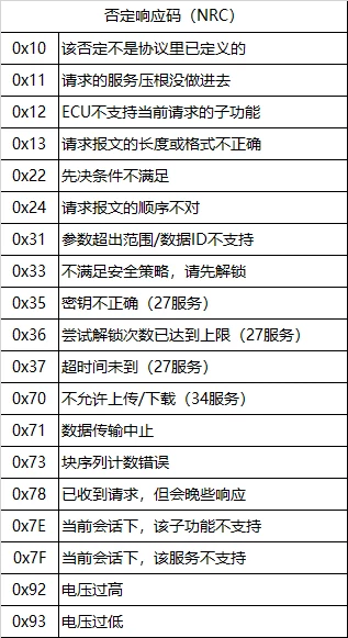 NRC:Negative Response Code(否定响应码)。如果ECU拒绝了一个请求,做出否定响应(Negative Response),它会在第三字节回复一个NRC。不同的NRC有不同的含义。本文开头时有一个常见NRC的图,当然完整版请参照ISO14229附录A。