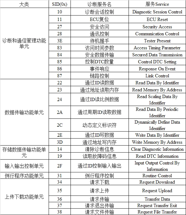 UDS的服务分为6大类,但常用的服务是加背景色的15种。这15种服务又可粗略地划分为权限控制、读取数据/信息、写入数据/信息、通信控制、功能控制这几类。